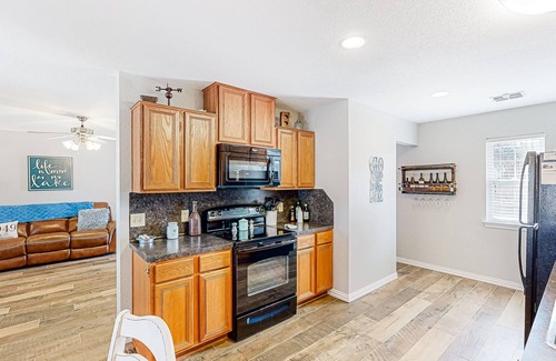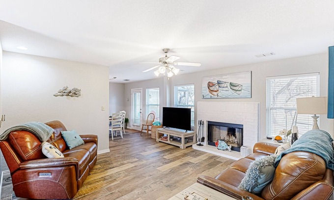 The single-level floor plan offers easy accessibility and has been recently renovated for complete modern comfort. The open-concept full kitchen is equipped to handle all your at-home meals. Leather sofas and a smart TV are ready to welcome casual downtime in the living room. Comfortable beds will whisk you away to a restful night's sleep after your adventures. Everyday home essentials include central air-conditioning, a private washer/dryer, and free WiFi for remote working or web browsing.