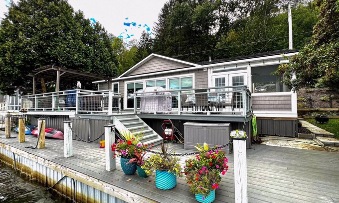 Lakefront home with private dock, lake views, kayaks, grill, large covered deck is located in De Ruyter. Lakefront home with private dock, lake views, kayaks, grill, large covered deck provides accommodation, featuring Parking, TV, Balcony/Terrace, among other amenities. This Cottage features Parking, TV, Balcony/Terrace, to make your stay a comfortable one.