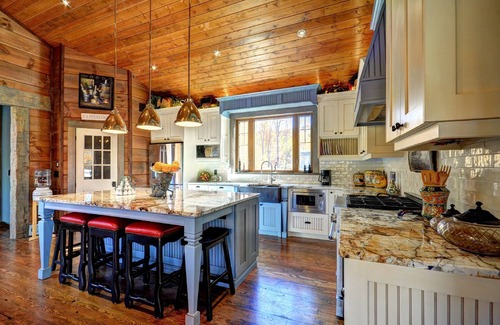 The custom, fully-stocked kitchen will be a popular hangout. A center island with barstool seating waits to be loaded with stacks of pancakes prepared on the Jenn Air range. At dinnertime, a harvest dining table seats 8-10. Add some ambient music from the iPod Bose docking station.