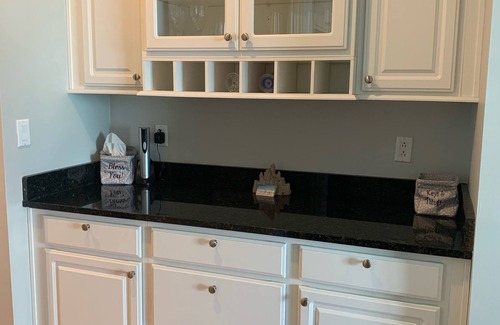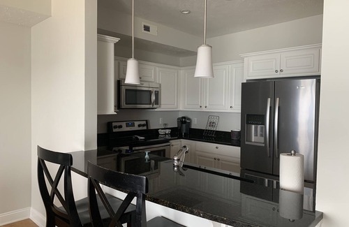 The condo is on the main level of a five-story, two-elevator serviced building. The Vista has a heated indoor pool which overlooks the Lake, its very own private beach with a fishing pier, and is just a short drive to "The Strip" (5 min) and Spire Institute (15 min). The master bedroom has a king-sized bed with a memory foam mattress accompanied by a walk-in closet, as well as a master bathroom with granite countertops and a spa shower. The second bedroom has a queen-sized bed. The elegant kitchen is fully equipped: dishwasher, microwave, blender coffee maker (Keurig and Drip/traditional), electric oven, refrigerator with ice-maker, toaster, cookware/bakeware, glassware and dinnerware for 6. Starter rolls of toilet paper and paper towels are provided. All new bath towels and sheets for Summer 2020!