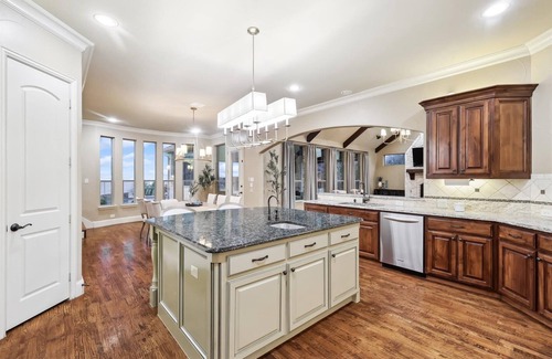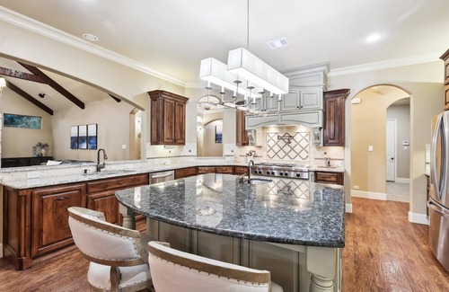 Everything is bigger in Texas and that applies to our vacation homes too! This 5-bedroom, 4.5-bathroom luxury estate sits on a sprawling 1.8-acres. Spacious & filled with timeless charm, this sophisticated space has everything you need for a good time. Amenities include an outdoor swimming pool, fire pit, fireplace, cinema room, game room & more!