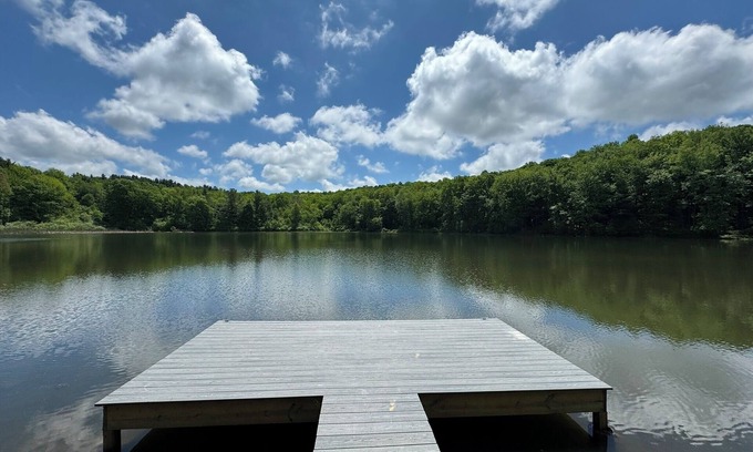 Brand new, private lakefront home. There are only 3 houses on this lake and we own a rent out 2 of them. Our 2nd home is 4 bedrooms/2 baths(link below) Great opportunity for large groups to rent both homes. Truly beautiful setting all year round. 20 minutes to ALL STAR VILLAGE. BELLEAYRE or PLATTEKILL skiing less than an hour drive. Charming local restaurants & boutiques are listed in our welcome book. 12 miles to ONEONTA. Great golf near by. Property offers 30 acres to explore if you so desire.