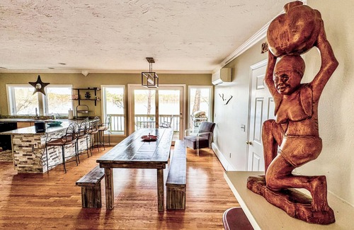 Beautiful waterfront property with Private lake beach just steps down to the water from the deck.