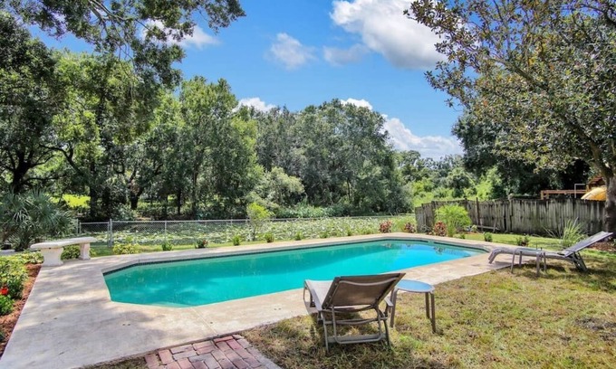Conveniently located.... Tranquil lakefront 4 bedroom home. Spacious covered lanai with BBQ, Fire Pit and POOL overlooking the canal. Check out the lake in one of our kayaks. You can also bring your own boat as it is a ski lake. Fenced back yard.