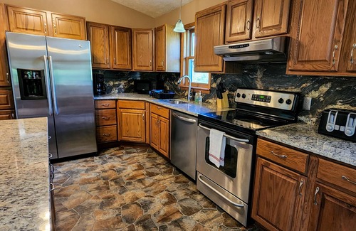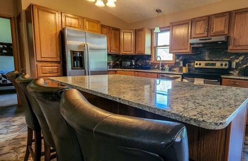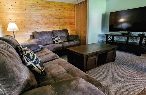 The basement floor (with ground-level,rear access) puts you right in a rustic setting with brand-new pine walls and ceilings. 2 additional bedrooms, another full bath, and 2 of the bedrooms have bunk beds along with a queen. The spacious game room includes a pool table, poker table, and a drink refrigerator. The 65" flat-screen TV can be used to watch sports, TV, gaming, or your favorite movies! The level opens up to a patio with a hot tub, fire pit, and more seating.