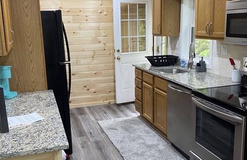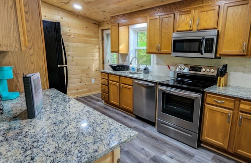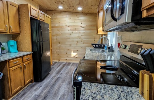 The basement floor (with ground-level,rear access) puts you right in a rustic setting with brand-new pine walls and ceilings. 2 additional bedrooms, another full bath, and 2 of the bedrooms have bunk beds along with a queen. The spacious game room includes a pool table, poker table, a sitting table, and a drink refrigerator. The 65" flat-screen TV can be used to watch sports, TV, gaming, or your favorite movies! The level opens up to a patio with a hot tub, fire pit, and more seating.