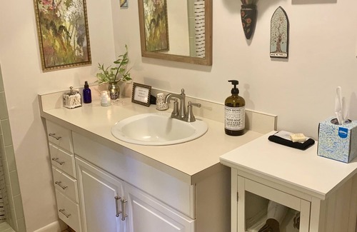 Inside the main house through guests' private entrance you will find the second accommodations and bathroom, a comfortable and clean private bedroom with an organic queen mattress, cotton linens and sitting room with television, refrigerator, tv, microwave and coffee maker. The suite's private bathroom boasts a spacious walk-in shower and self-care amenities.