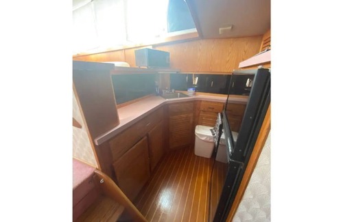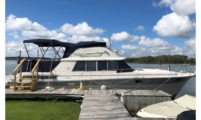 Spend your days lakeside at our beautiful Silverton boat! Enjoy sunsets from the sundeck! Bring your boat up to 20’ or rent one of ours! Our boatel is well appointed with a comfy full-size bed, two twin beds which can convert to a full-size bed, couch, WIFITV, coffeemaker, full kitchen, two bathrooms. Plus all the necessities to make it feel like home, including coffee, tea, all linens, and deck chairs. Community barbecue BBQ and picnic table just outside your door.
