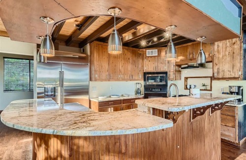 The full kitchen is stocked with a Brewmaster coffee maker, coffee bean grinder, electric kettle, stainless steel appliances, enough utensils, and gadgets to cater to large groups including the kiddos. With custom cabinets, sleek counters, designer finishes, and a fully stocked coffee bar, it is as beautiful as it is functional.