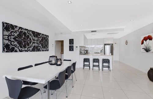 The apartment can comfortably sleep up to 8 people. There are 3 bedrooms. The main bedroom has a king bed (can be split in to 2 king singles) and the other 2 bedrooms each have 2 king single beds. There is also a pull-down queen bed in the lounge. There are 2 modern bathrooms (one an en-suite to bedroom 1), both with walk-in showers. The main bathroom also features a free-standing bath.