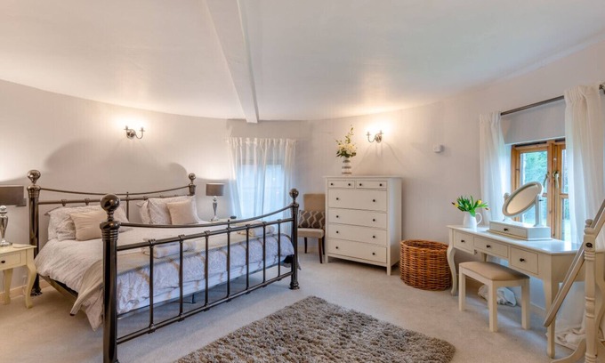 At the end of a long day exploring the local trails, kick off your walking shoes in the entrance hallway and follow the inviting warmth of the roaring wood burner into the open-plan lounge/diner. Featuring beautiful wooden beams reminiscent of times past, this endlessly social space boasts a truly warming ambience that invites guests to unwind and dine with loved ones long into the evening. At the heart of this home-from-home, nestled within the roundel which once formed a working part of the original Oast, the spacious kitchen perfectly combines contemporary touches with country cottage style decor that adds a touch of pure sophistication. Sharing the same charm and character as the ground floor, the super-king-size bedroom upstairs is also nestled within the roundel part of the building and offers access (via a curved staircase with no handrail) to the second floor which boasts a quaint reading nook and elegant en-suite shower room. There is also one double bedroom and one twin bedroom on the first floor, and a stunning family bathroom with a quirky curved brick-wall shower and roll-top bath; unwind with a long soak, enjoying views across the countryside.