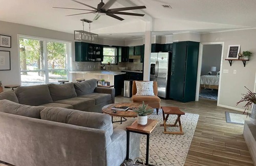 The main house has 2 master suites each with a queen size bed and waterfront views. The kitchen and living area are all open concept in the middle of the house with one bedroom to each side. The Cozy cottage sets to the back of the house, and it is an open concept with 2 bunkbeds with queen on bottom and twin on top. This room has a full-size bathroom as well and a sitting area.