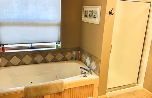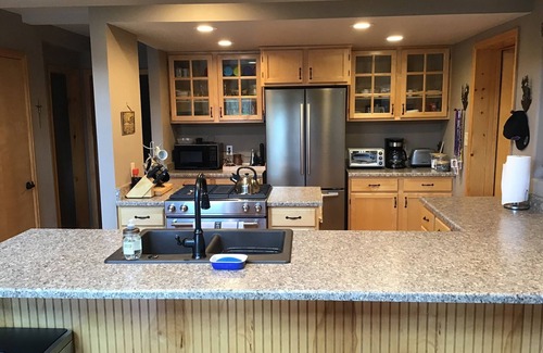 On the main level is the master bedroom which has a king bed, private bath with a jacuzzi tub & separate shower. The door to the master bdrm is a pocket door that does not lock. The living room has a queen sofa sleeper & a gas fireplace for cozy days & nights. There’s a 1/2 bath nearby. Please note that the 2 bathrooms on this level have pocket doors that do not lock. Also on the main level is an updated modern kitchen. A coffee maker & a Keurig are provided. The laundry room is on the main level with full size w/d. An attached garage completes this level with inside parking for 1 vehicle.