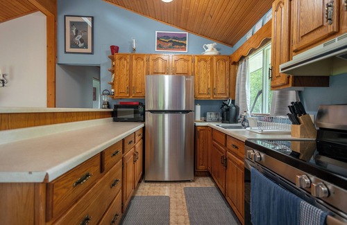 Relax on our spacious 20x20 deck or by the bonfire pit, and enjoy the convenience of a fully equipped kitchen, AC, heat, and a cozy woodstove. Our sunroom offers a serene atmosphere, while the large curved smart TV with Starlink internet, and a collection of 300 DVDs and VHS tapes provide endless entertainment options if Netflix is not enough. We also have board games.