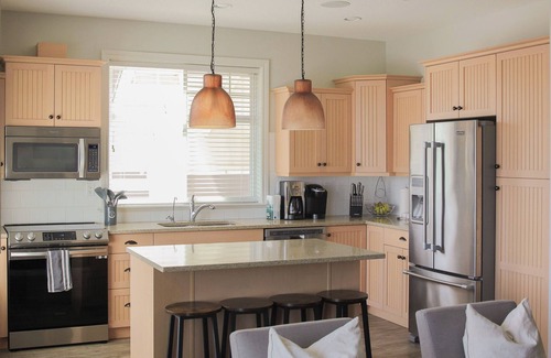 Welcome to the Lakeview Cottage located in the beautiful Cottages on Osoyoos Lake! This place is big enough for all of your family members! Four bedrooms plus a spacious rec room with multiple beds AND a huge indoor sun room with 3 full bathrooms! Lots of space to unwind, lots of natural light to soak in, and a short walk to the beach below. House is fully stocked with all the utensils and appliances you need and some extras for kids. House also includes 4 smart tv's, a bbq, fireplace, and a 4 person golf cart.