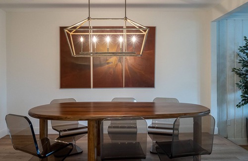 Grand living room, TV, desk, full kitchen with fantastic appliances equipped to entertain, a dining room table that seats six.