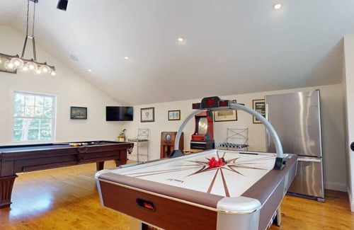 INDOOR LIVING: spacious living areas spread across three floors, stocked kitchen, televisions, pool table, ping pong, air hockey