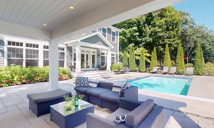 OUTDOOR LIVING: Pool and pool-house/cabana with half bathroom, Hot tub, al-fresco seating, outdoor shower; gas and charcoal grill; outdoor chess set, firepit; second-story deck overlooking backyard; bicycles with wagons and Burley trailers