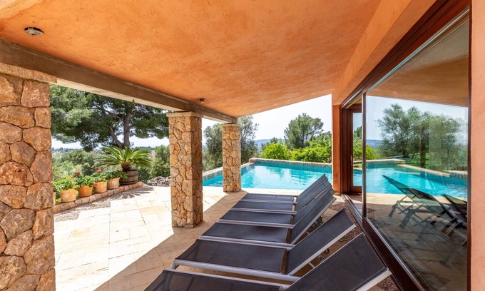 Great renovated finca with private pool for 8 people, with 4 double bedrooms, 4 bathrooms, heating, WiFi internet, comfortable living area with satellite TV, fireplace and plenty of seating, open dining area, large fully equipped kitchen with additional dining area, green outdoor area with furnished terraces and large infinity pool (20m x 8m), barbecue area and lots of garden, ideal for chilling and playing, in Bunyola, Mallorca