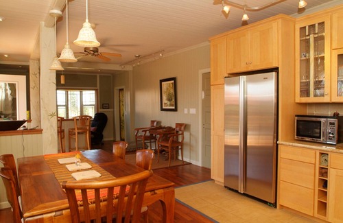 The Artists House, Permit # STLA 2017/0002 is a home away from home with the comfortable furnishings and great amenities. The fabulous Lana'i sunsets can be enjoyed outside on the deck where there is glass dining room table with 6 chairs and bbq to enjoy. There are two bedrooms, one comfortable king bed in the master bedroom which has a joined master bathroom and a comfortable queen bed in other bedroom. The living room has a sofa bed with a queen temper-pedic mattress and a single futon bed which is used as a loveseat as well if needed. There are two bathrooms, one with a jet tub and the other with a double head shower. There is an on-demand hot water heater so, there will always be hot water! There is an outdoor shower after the beach or just to be in the Lana'i Hawaiian air. No need to bring too many clothes as there is an LG washer and dryer that is top notch! The Artist's home is a fully renovated double insulated plantation home from the 1930's that will give you the feel of being back in time and yet, with all the amenities of comfort such as granite countertops, dishwasher, specialty wood floor, fans, etc . This home is owned and was fully renovated in 2009 by Jordanne, who started her fine art painting career in 2002 on Lana'i and now lives on Maui as a successful painter. Jordanne opened a one-woman Gallery called the Jordanne Gallery in Makawao, Maui in 2009. She resides in Maui with her husband and 2 young children. Her early artwork is on the walls of The Artists House and creates a lovely feeling of plantation life ambiance. She has used the actual pineapple grass and bamboo from Lana'i to create a beautiful subtle mural. You can swim at Manele Bay, play tennis, golf, attend free water aerobics at the local heated pool, hike the Munroe Trail, drive to different parts of the island such as Polihua Beach, Shipwreck Beach, Garden of The Gods, and then come home and enjoy the rest of the evening in the QUIET area of town at the Artists home. Lana’i is known for the roosters and they will crow at all hours of the day and night - Jordanne needed her own oasis where the crowing of roosters wouldn’t hinder her own living experience on Lana’i, so, she created this oasis. The location can’t be explained enough (worth any extra monies) as other rentals are based in the center of town where the roosters can be heard. The home is located in the old Japanese section where the surrounding neighbors are very respectful. Grocery shopping as well as retail is still a short 7 minute walk. There is a newly renovated movie theater that is also a short 7 min walk away. Car rentals are usually available through Jordanne's contacts. You can have dinner with a short walk to Pele's Other Garden (full bar available,) Cafe 565, the Blue Ginger, Lana’i Hotel (full bar) or Canoe’s or dine at the Artists House fully equipped kitchen. We hope you love your stay in the Artists House with Aloha!