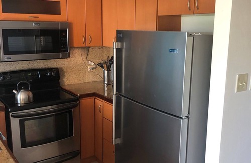 The second floor features an open floor plan with a beautiful, fully equipped kitchen with breakfast bar and seating for four. Furnishings include chairs and a wicker love seat in TV area, two leather sofas in the sitting area leading out to a small balcony which is perfect to enjoy your morning coffee. Dining area includes glass top dining table with seating for four. This level also includes a half bath, and a laundry room with washer and dryer.
