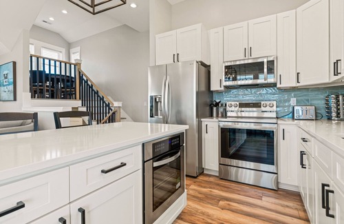 A large, spacious Lounge has a large flat-screen TV to watch movies or sports. The game area has a Foosball table and a Mortal Kombat® arcade game. A second full-size refrigerator and a kitchenette area will be a convenient amenity to enjoy beverages and snacks with easy access to the outdoors. The 6th bedroom at this home is a King Jr. Master Suite which shares a semi-private bath (tiled shower) with the Lounge/game area. On the outdoors, there is access to the fully enclosed fenced pool deck around the private pool* (11' x 29'; pool open mid-May to mid-October) with outdoor furniture that includes a picnic table and lounge chairs. There is parking for 5-6 vehicles in the driveway. [Note: garage is not available for guest use.]