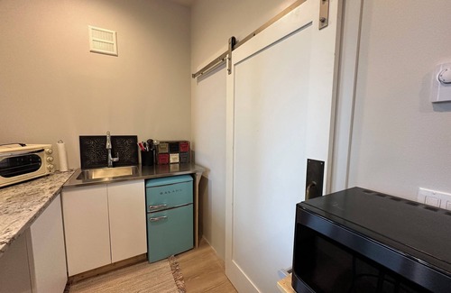 Unwind in this serene guest suite, perfect for the solo traveler seeking peace and tranquility. This downstairs studio offers a stylish and cozy retreat. Trundle bed serves as both a couch and, when expanded, a comfortable king bed.