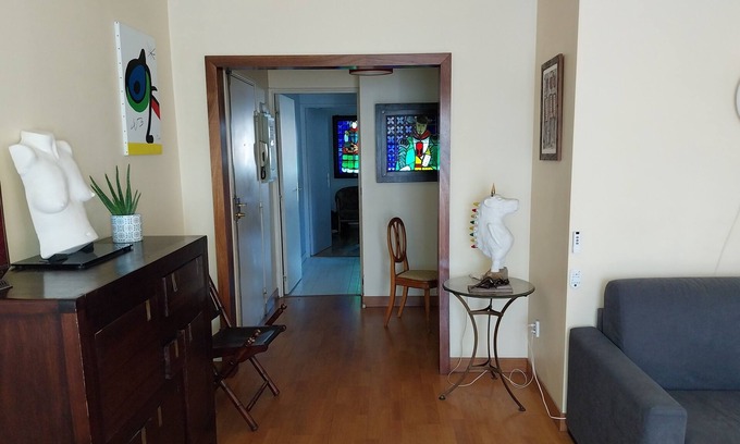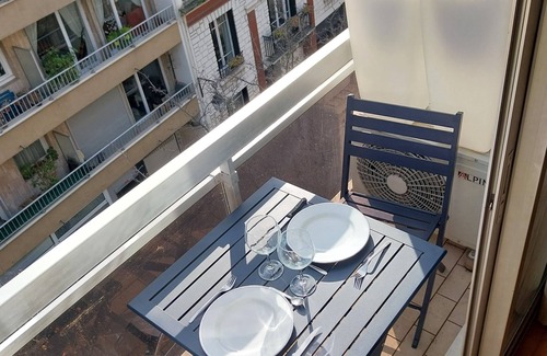 It has a large, very bright living room with a 2-seater convertible sofa and has air conditioning, a furnished balcony with a table and chairs, a separate fitted kitchen, a bathroom with bathtub, a toilet, a desk and a large bedroom with a double bed of 160.