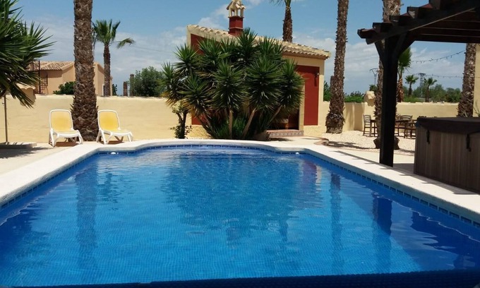 Our wonderful 3 bed villa is located within the orchards just outside the Spanish village of Rafal. It's set in 5,000 sq.m of spacious grounds, and has plenty of areas for relaxation. It has quite a few mature orange trees that you can pick if they are in season. There is ample parking for several cars.