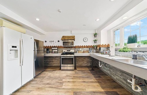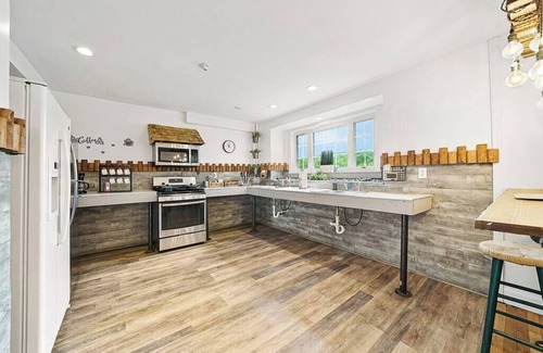 The open kitchen and dining areas allow the whole family to gather and share a meal together. The counter bar is a great spot to hang out while dinner is made. The dining table is big enough for everyone to sit down together. Guests will love the large double sinks and stainless appliances.