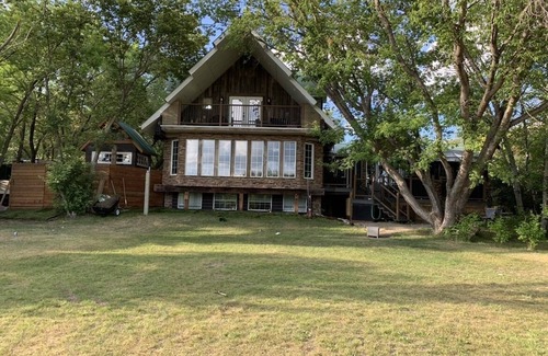 6500sq ft 4bd log cabin. Can sleep 20+ people very comfortably with plenty of room for more. The kitchen is supplied with dishes, pots and pans etc. The house is very spacious with loads of character with the barn board doors, trim and vaulted ceiling. Great room with cozy wood burning fireplace. Large deck with gas bbq just off of dining room which seats 12. Towels and bedding are supplied. Steps away from the lake. Side yard is fenced and has a cute playhouse for children to play.