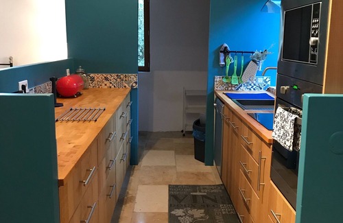 A charming cottage built in stone in the countryside facing the Pic Saint-Loup ideal for a dream holiday with family or friends. Fully equipped kitchen (fridge, oven, microwave, blender, toaster, electric orange press, coffee maker ...), nice indoor living room overlooking the private infinity pool, summer kitchen also equipped (with barbecue, gas stove, small fridge ...), as well as a bowling alley surrounded by a garrigue tree without any opposite.