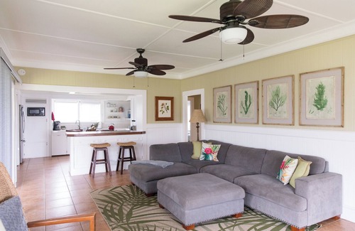 Live like a local at Oceanfront Harmony, a professionally managed and operated vacation rental located -- as the name says -- on the oceanfront. This 4- bedroom, 3-bathroom classic Hawaiian historic home, is fully equipped with large kitchen, bar area, living room, private decks, and "al fresco" lanai/dining room, offering plenty of space for friends and family. Sleeps 7 comfortably. Works well for multi generation families (grandparents and parents in two bedrooms with King beds) and kids in the other rooms; we've also hosted several couples or groups of friends. Enjoy gorgeous ocean views and stunning sunrises/sunsets within a charming Kauai neighborhood.