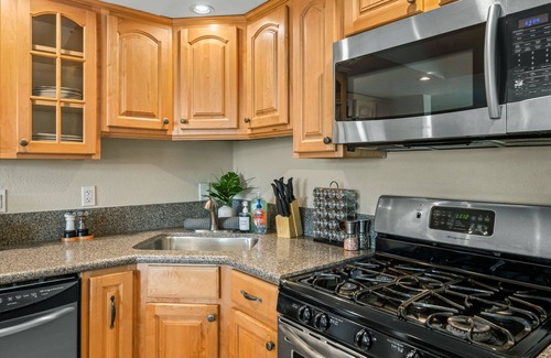 The kitchen is fully stocked with seasonings, pots/pans, cutlery, utensils, cups, plates for adults and children, and BBQ essentials. Get ready to have some family meals! You also have a dishwasher, fridge, stove/oven, and microwave. There are 4 stools that you can use to eat or drink at the counter and converse with your friends/family. The dining table has room for up to 6 guests as well.