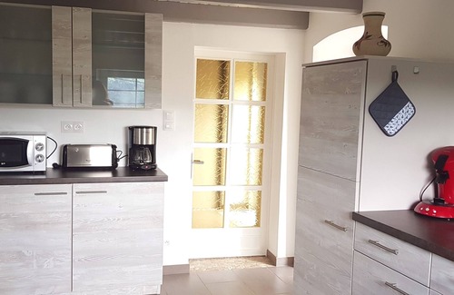 Ground floor Living room, dining room with table chairs for 8 people, sofa and two armchairs, Television, For your comfort a fitted kitchen (equipped with ceramic hob, extractor hood, oven, refrigerator + part freezing, microwave, electric coffee maker, toaster, kettle, raclette / toaster, pancake crockery dish and crockery pots and pans ....).