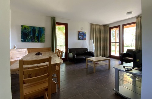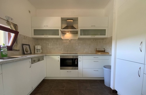Spacious holiday home on a large plot. The house is located on the edge of the park with a view of fields, vineyards and forests. Ground floor layout: living room with patio doors to two terraces. Dining area, spacious, fully equipped kitchen with dishwasher. Bathroom with bath, shower, sink and toilet. Bedroom. Layout 1st floor: three bedrooms with balcony. Bathroom with toilet. Front of house: spacious garden with walnut trees. Rear: large terrace with lawn. House is non-smoking; no pets are allowed.