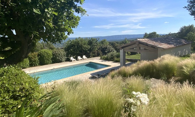 House built on 1 hectare of land, large plot planted with trees and Provencal species, with views over the famous Luberon villages (Menerbes, Goult, Roussillon, Bonnieux), absolute peace and quiet, ideal for relaxing and rejuvenating with family and friends.