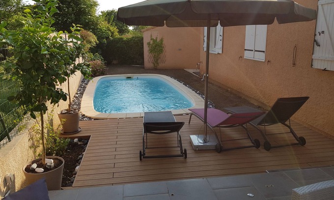 Large single storey house of 120m ², 3 bedrooms including 1 en suite with shower and sink, large open living room / dining room / living room opening onto a double terrace facing south, dining area and relaxation pool 8mX4m, surrounded by lawn Mediterranean.