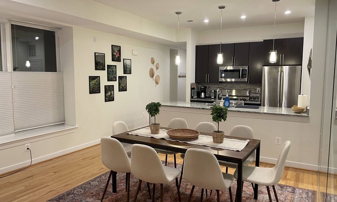 This 4 bedroom 3.5 bath modern townhouse is located on a quiet street, yet close to many dining options on both 14th and 11th street. The house has 4 beds and a large convertible couch so can easily accommodate 10 guests. Air mattresses are also available on request.