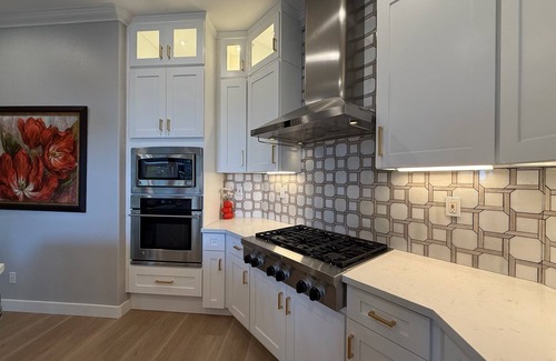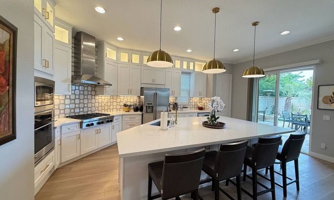 Welcome to your recently upgraded coastal retreat, nestled on a peaceful, tree-lined street in the heart of Carmel Valley. This spacious 5 bedroom, 3 bathroom home is thoughtfully designed with both comfort and function in mind. Ideal for families, professionals, or guests seeking a luxury experience just minutes from San Diego’s best beaches, trails, and dining destinations. As you arrive, you’ll be welcomed by a quiet residential street and mature landscaping. Step inside to beautiful hardwood floors and an open-concept floorplan filled with natural light, tasteful décor, and high-end furnishings throughout. The entire home has been recently renovated with upgrades throughout, including modern finishes, new fixtures, updated bathrooms, and a fully remodeled kitchen.