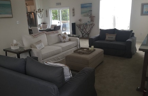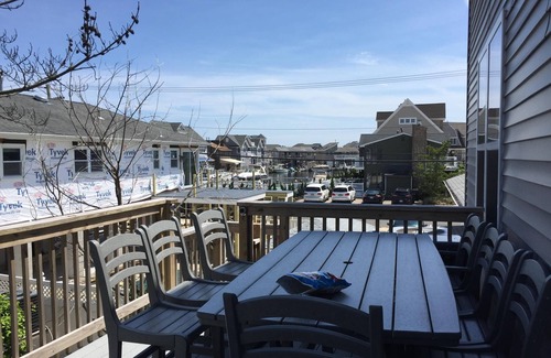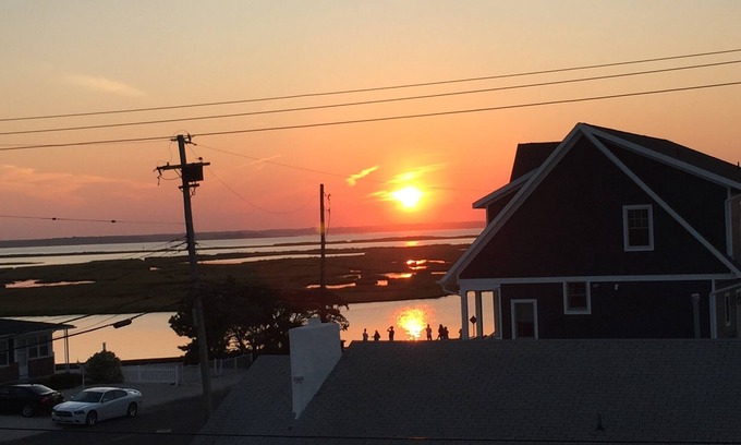 Fabulous newer home with beautiful sunset views near the bay. The Chadwick Beach Island Bay Beach and playground are right at the end of block. Perfect for large families quiet wider streets for biking and strolling. A quick 5 min walk to mini golf & 10 min walk to the Ocean beach. Plenty of room to entertain both inside and out. Large living room open to dining room and kitchen open to beautiful rear trex deck with water views. Additional family room, laundry room plus bath also all on first floor. Upstairs has huge King master suite with private double sink bath. queen bed guest room, queen and modern daybed in next guest room. 4th bedroom has a full and bunk beds with a trundle. In addition we have a full bath and as a bonus an open sitting room that opens up to a huge upper front porch with sunset views. Plenty of outdoor seating, out door shower and a fire pit below. An outdoor bbq, 4 large Tv's inside, cable and wifi free of charge.