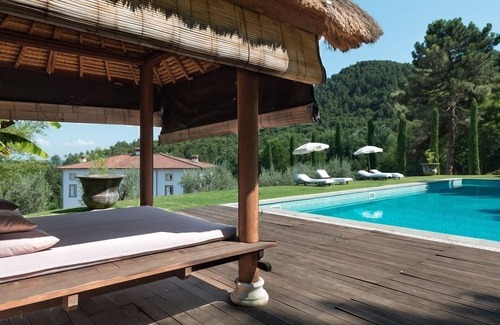 Villa Bella Vita is an historical period property set in a private 100-acre estate in the hills of Lucca, with swimming pool, olive groves, fresh grown vegetables, and paths and walks through private woodlands and natural streams. The estate includes a beautifully restored villa built in the late 15th century, with three floors, elevator, a luxury designer kitchen, five bedrooms and spacious bathrooms with spa facilities, and a classic Tuscan 18th century farmhouse with a game room, kitchen with open fireplace, and three double bedrooms.Villa Bella Vita is set in a marvelous Italian garden lined by cypresses and palm trees, a unique mélange of tradition and exoticism, and the garden is surrounded by elegant boxwood hedges. Beyond the olive trees, along a cypress-lined path, one reaches the high end of the garden, featuring a sweeping panorama across the Lucca valley, a large swimming pool, sunning area and Balinese massage pavilion. Next to the pool is a covered Bali-style summer kitchen, a perfect, relaxing venue for sipping a glass of red wine while admiring the spectacular views, or enjoying a lunch in the open air served at the sandstone dining table. There is also a kitchen area with two refrigerators and an automatic ice machine.