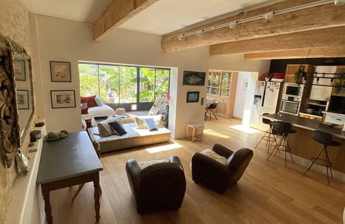 It is a large semi-detached village house with exposed stones, wooden beams. It is air conditioned in summer.