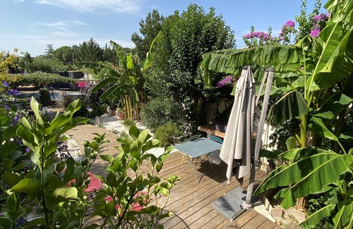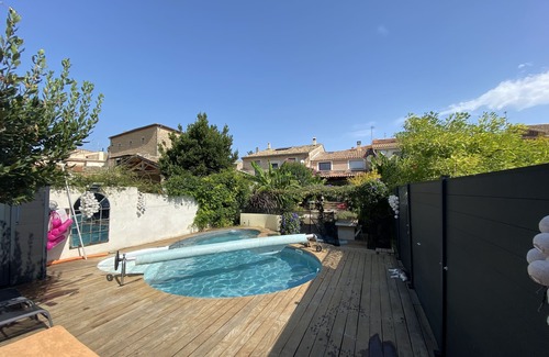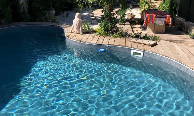 We have a small garden but which is not overlooked with a swimming pool of 6. 8 X 3.0 and 1.5 deep. It is secured by a barrier. All around we have a wooden terrace with a shaded garden furniture for napping. it is equipped with a barbecue and a gas plancha.