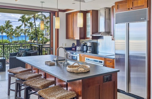 The expansive living area, adorned with comfortable furnishings and tasteful decor, beckons you to unwind in absolute bliss. Travertine tiled floors lead the way to a Chef Roy Yamaguchi-designed kitchen, equipped with full-sized appliances and adorned with granite countertops that mimic smooth lava rock, inviting culinary indulgence while enjoying panoramic views of Hawaii's beauty just beyond.