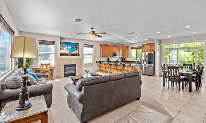 For your next Southern Utah vacation, book Southern Comfort in Las Palmas today! This relaxing 2 bedroom 2 bathroom condo can comfortably sleep 9 people or as many as 11 with the use of an additional air mattress. Spend your day splashing in the pool or soaking up the sun on one of the provided courts. With close access to Snow Canyon and Tuacahn Center for the Arts there will never be a boring moment! Enjoy the Southern Utah sun and hike around or explore the city during the day, and as the sun sets head back to your patio for a BBQ in the shade, all from the comfort of your vacation getaway!