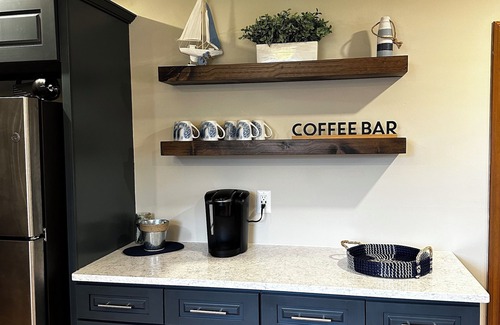 The first floor offers a large living area with ample seating and a television for relaxing after a day in the sun. The kitchen was just renovated in 2024 and is equipped with all major appliances, dishes, silverware, glasses, pots and pans. A deck with a grill and outdoor furniture is located off the kitchen. There is also a bedroom, bathroom, and laundry all on the first floor.