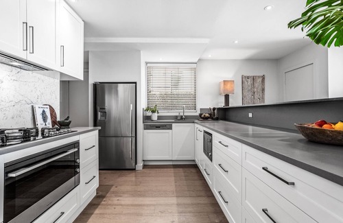 A fully functioning Chefs kitchen with caesar stone benches and quality appliances including: large Fisher + Paykel electric oven + gas burner hotplates, Miele dishwasher, two refrigerators, Miele microwave oven, expresso machine and ice machine.