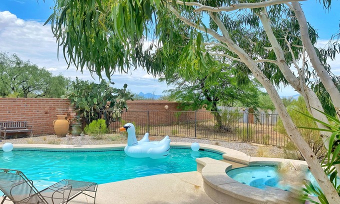 Where the pavement ends and the good times begin: Comfortable, air-conditioned desert home on 2.5 acres. Relax and enjoy the pool area with views of Kitt & Baboquivari Peaks, take cactus and wildlife walks, star-gaze, play horseshoes, and sit around the fire. Desert exploration is right out the front door; on your horse, bike, ATV, or on foot!