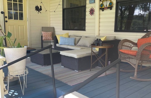 water is perfect for paddleboarding, kayaking, or just floating in a tube! Hang out on the boat dock in the large, covered seating area, or out on the sun deck. Kayaks and Paddleboards are available for use, but guests should bring safety vests. Spend evenings gathered around the firepit, or the large back porch. home has 3 queen beds, and we also keep a plug-in air mattress, kid cot, and pack and play on hand Board games, streaming TV, books, etc. We are close to a few public boat launches.